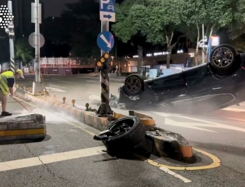 台中瑪莎拉蒂自撞分隔島!整車烏龜翻、右前輪噴飛慘狀曝