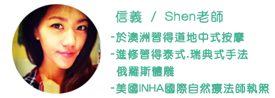 專長:經絡推拿、精油SPA、運 動按摩 關於老師:我認為按摩不該只是如坊間腳底按摩店或是推拿、美容院 只是放鬆,紓解痠痛,而是能夠透過不同的技巧、力道、速度,心也能跟著靜下來,呼西變得深 入沈著,五臟六腑也跟著被按摩了。為了讓顧客身心靈都能得到放鬆,決定進修並得到美國INHA自然療法師的證照,其間跨領域虛心學習各式:泰式古法按摩、瑞典式淋巴按摩、中式筋絡按摩、俄羅斯體雕手法等,結合各手法之優點,融合成自己的手法。