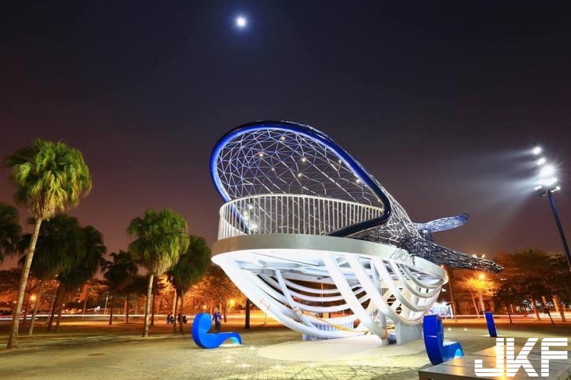 安平港濱歷史公園地景藝術「大魚的祝福」,鑲著愛台灣的心,剛硬的不鏽鋼線條形成不落柱結構,卻散發無比溫柔力量,吸引許多民眾拍照打卡,23日有網友將空拍影像PO上網,讓人直呼「超美的」「這時候看大魚超有感滴」!
