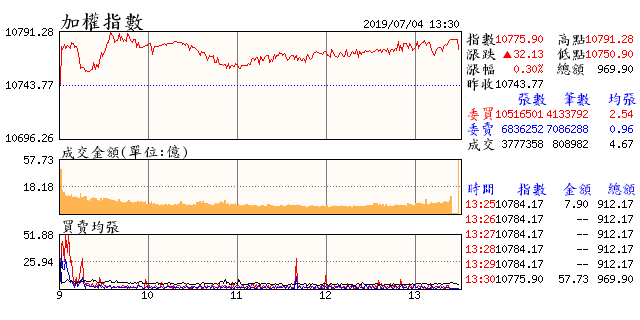台股歷經昨 (3) 日大跌 121 點後,今天隨美股強勢,台股回神反彈,盤面上又以被動元件、中小型半導體股表現最亮眼,加權指數終場上漲 32.13 點,收在 10775.9 點,收復 10 日線,成交值微幅縮至 969.9 億元。
