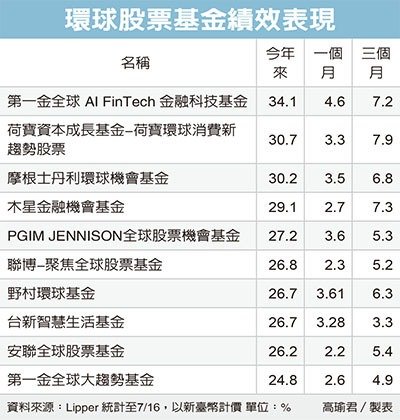 再觀察環球股票基金績效今年表現,根據LIPPER統計,今年以來平均122檔基金繳出18.2%的表現,第一名為第一金全球AI FinTech金融科技,今年繳出34.15%的佳績,其餘包含荷寶環球消費新趨勢股票、摩根士丹利環球機會基金也有超過30%漲幅。