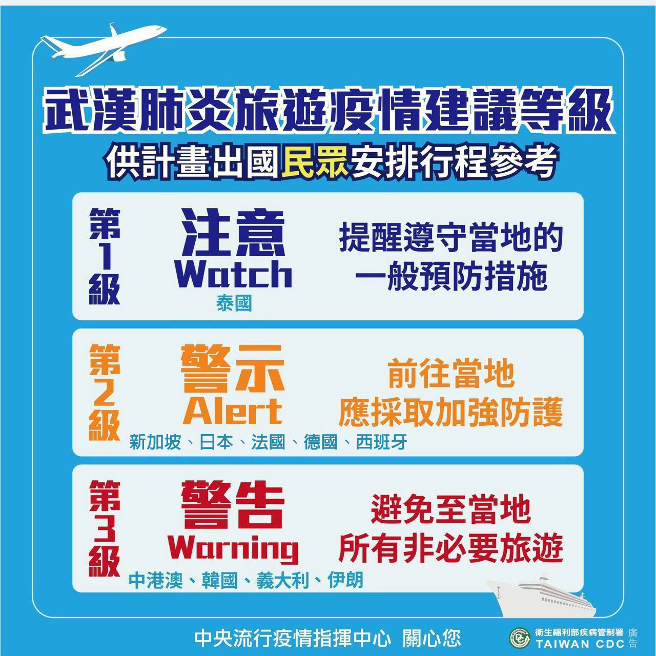 指揮中心7日指出,截至3月6日,法國累計613例,9例死亡;德國累計639例;西班牙累計374例,5例死亡。且三國已有數起群聚事件發生,評估已出現隱性社區傳播鏈,因此7日起提升法國、德國及西班牙旅遊疫情建議至第二級警示(Alert),民眾前往當地應加強防護。此外,從這三個國家入境的民眾,應落實14天自主健康管理。