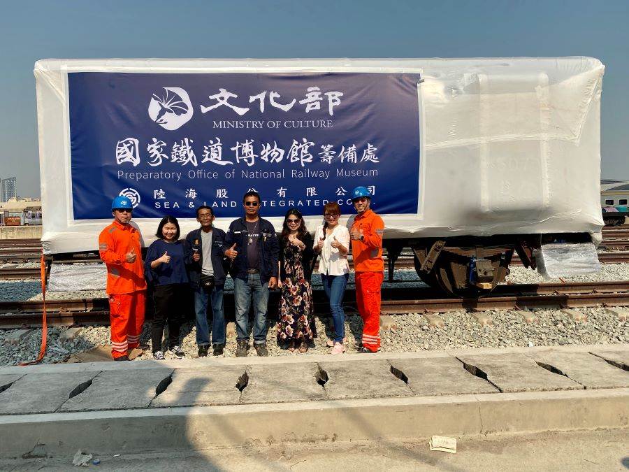 守車起吊前三方工作團隊見證歷史的一刻:泰鐵邦實站長(中)杜喜、駐泰文化組全體同仁(右二右三左二)、國際運輸團隊(右一左一)。(圖取自文化部官網)