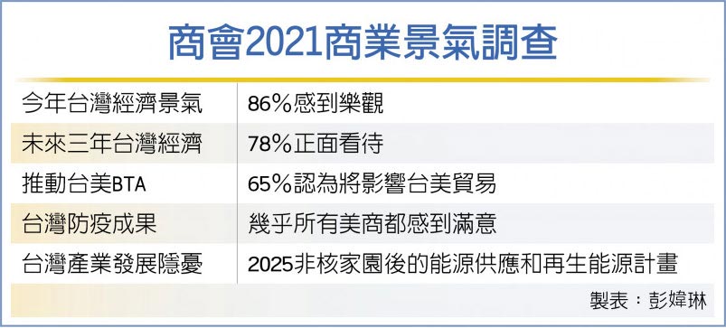 台灣美國商會21日發布「2021商業景氣調查」,高達86%商會會員樂觀看待2021年台灣經濟前景,比例較去年近60%大幅提升,為歷年最高;同時有超過78%企業看好台灣未來三年經濟表現,有40%企業計劃擴大在台徵才。美國商會表示,現在是台灣的黃金時刻,台灣應把握優勢發展。