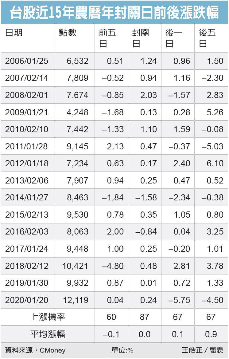 台新投顧副總黃文清指出,封關前漲幅較小在於年前獲利了結及長假效應的心理影響,但以近幾年農曆年後開紅盤表現來看,抱股過年似乎勝算頗大。