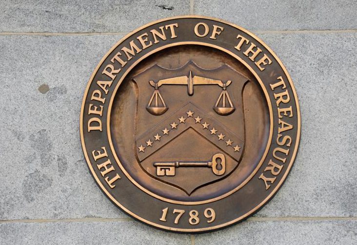 資料圖片:美國華盛頓,美國財政部標識。 REUTERS/Andrew Kelly