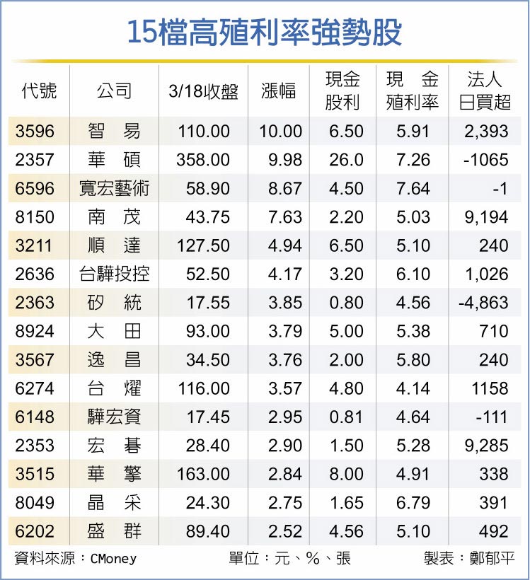 全球產業去年籠罩疫情陰霾下,造就通訊及遠距商機,相關供應鏈基本面逆勢轉佳,今年配息豪氣。其中,智易將配發5.5元現金股利、資本公積發放1元,每股配息6.5元,登上新高,法人連兩日買超4,387張;華碩發出26元現金股利,配息率達73%,股價18日創八年來新高。寬宏藝術、南茂、順達、台驊投控、矽統、大田、逸昌及台燿,殖利率均逾4%,漲幅落在3~9%。