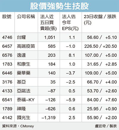 以法人近五日進出來看,台耀、高端疫苗、逸達、和康生、藥華藥等五檔則獲得140張至1,051張不等買盤挹注,力撐股價維持不墜。