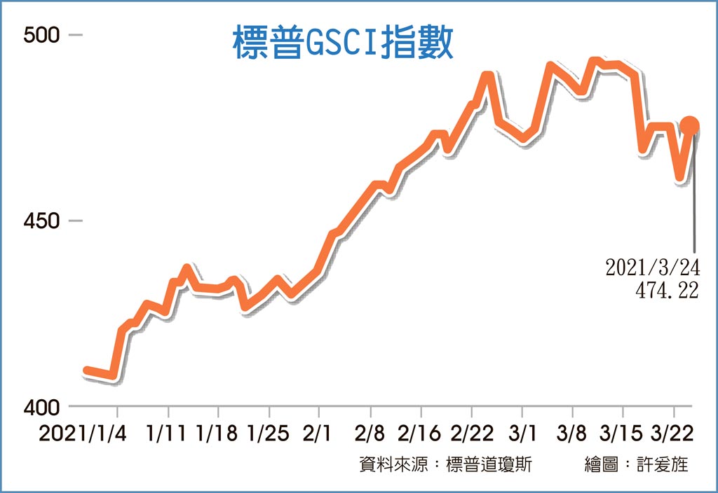新冠肺炎疫苗問世後,市場樂觀預期全球經濟復甦,為商品需求帶來明亮前景,激勵大宗商品價格在2021年急速攀升。2021年截至3月24日止,追蹤24項商品價格的標普高盛商品指數(S&P GSCI Index)累計揚升15.82%,分項指數標普高盛能源指數同期累計大漲24.34%。