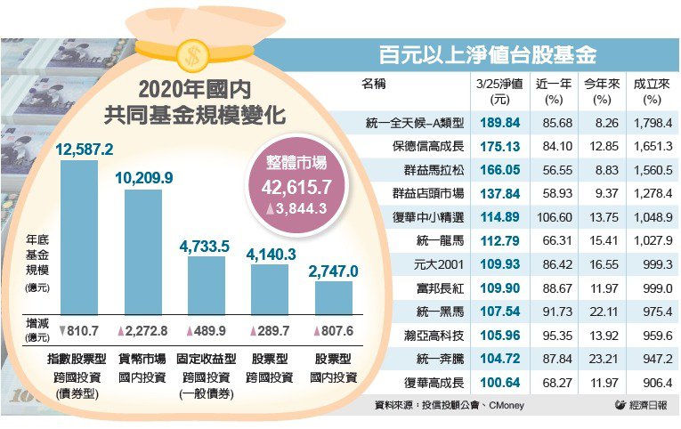 不過,貨幣型基金報酬率雖高於銀行存款,終究只是資金暫時停泊的港口,下一站無不瞄準更高報酬的商品,帶動台股基金、海外股票型基金、多重資產型基金等去年規模都出現明顯增長。尤其是台股,2020年上演大驚奇,2、3月時市場一片悲觀,集中市場加權指數3月19日盤中下殺至8,523.63點波段低點,但旋即反彈不回頭,甚至在下半年受惠「護國神山」台積電領漲、「去中化」電子股受惠股訂單噴發等效應,大盤叠創新高價位,投信操盤的台股基金績效表現突出。