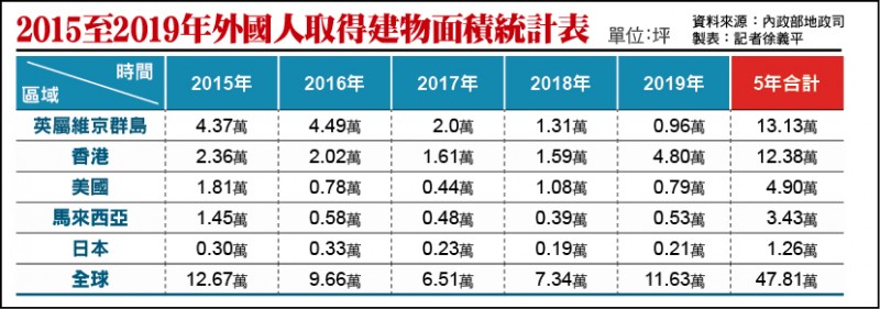 根據地政司統計,二○一五至二○一九年僑外資在台買進逾十五萬坪土地、近四十八萬坪建物,買地前五名依序為英屬維京群島約四.八九萬坪、香港約三.六三萬坪、日本約一.○六萬坪、美國約○.八四萬坪,以及馬來西亞約○.七六萬坪;前五名合計在台獵進逾十一萬坪土地,占全數僑外資在台獵地比重約七十四%。