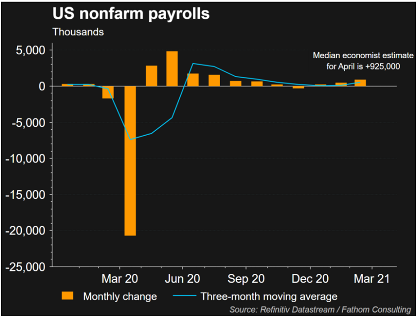 路透調查顯示,美國4月非農就業崗位料增加92.5萬個,創去年8月以來最大增幅,3月為增加91.6萬。