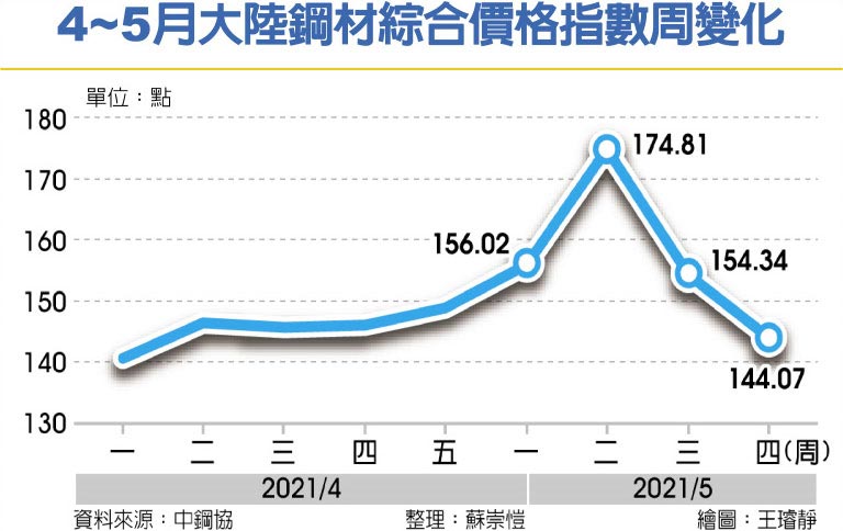 據中國鋼鐵工業協會監測,從2021年初至5月中旬,大陸鋼價出現漲勢。截至14日,CSPI報174.81點,較2020年底暴漲40.4%。但是在大陸遏止原物料飆漲下,截至28日,CSPI跌至144.07點,等於回吐過去兩個月的漲點。