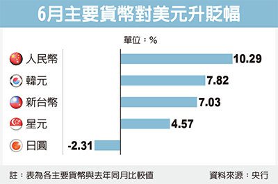 若再觀察主要國家貨幣對美元匯率,新台幣兌美元匯價6月為27.80元,年增7.03%,亞洲之中僅輸年增7.82%的韓元及10.29%的人民幣;若改與去年12月比較,新台幣匯率升幅達2.67%,為亞洲最強勢貨幣。
