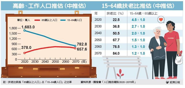 老年人大增,青壯年負擔嚴峻。國發會預估,2040年老年人口占比將突破三成,青年年人口則跌破六成。我扶老比(老年人口占15至64歲人口之比率)由2020年的22.5%,快速爬升至2040年的50.5%、2070年的84%。