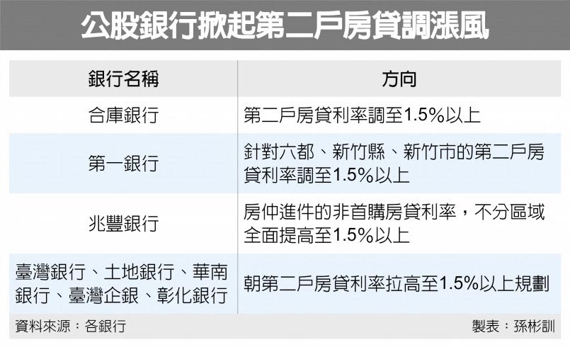 除了合庫銀、一銀、兆豐銀,臺灣銀行、土地銀行、華南銀行、臺灣企銀和彰化銀行等也表示,朝調整第二戶房貸利率的方向規劃中。