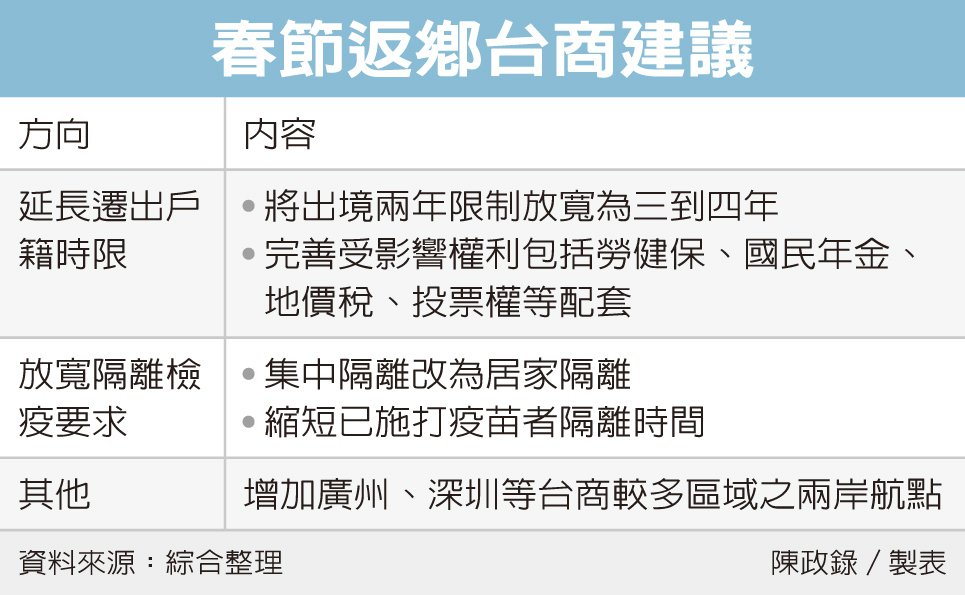 台企聯會長李政宏表示,各界預估明年春節期間,返台台商人數在3萬到4萬人之間,這數字可能有點保守,因為自疫情以來將近兩年,若時限未放寬,「擔心被遷出戶籍而返台的需求,可能比回家過年來得多。」