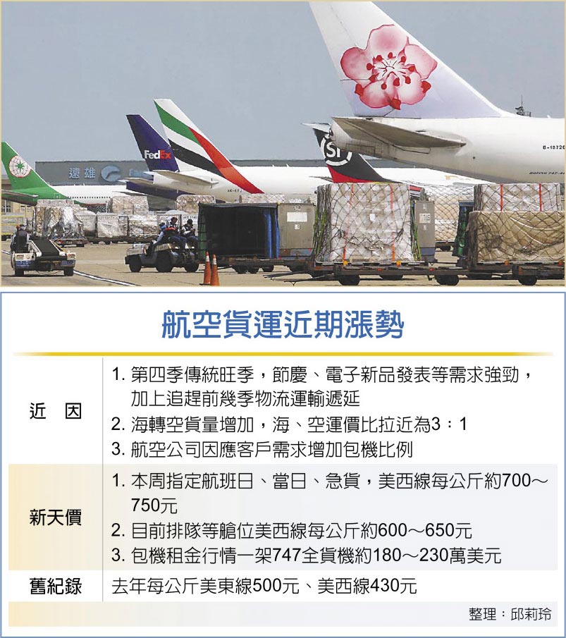 航空貨運運價漲出新的天花板價!貨代業者表示,航空貨運在本周只要是當日裝機、急件的運價已經跳增到大約700~750元,目前12月艙位已滿艙封盤,上周美西線排隊等候艙位的運價每公斤約600元,目前美西線每公斤已來到約650元,主要是電子業、半導體設備、電動車等上下游供應鏈大量出貨,不只搶艙位,也砸錢包機趕出貨。