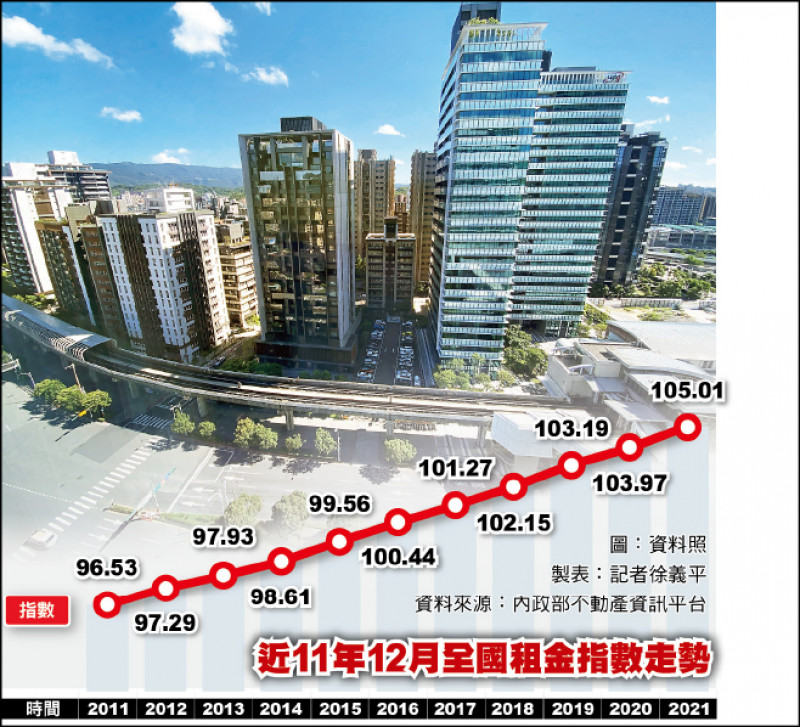 根據主計總處最新發布的租金指數(消費者物價房租類指數),去年十二月達一○五.○一,自二○一一年二月至今沒有跌過,其中僅二○一四年十一、十二月連兩個月維持在九十八.六一,及二○二一年六、七月連兩個月維持在一○四.二八,其餘全都上漲。