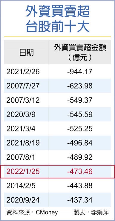 三大法人合計賣超528.74億元,其中,外資賣超473.45億元,為史上第八大賣超金額,賣超標的之冠為台積電,金額高達116.15億元,其次是聯電、元大台灣50、聯發科、日月光、欣興、長榮、鴻海、富邦金、聯詠等權值股,成為外資提款機。