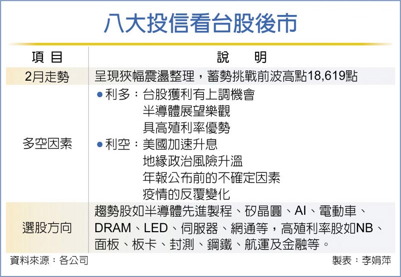 台股金虎年開市,多頭一路過關斬將,加權指數重新站回萬八關卡及月線,包括台新、中信、新光、凱基、群益、復華、野村、瀚亞等八大投信預測,美國聯準會(Fed)升息效應及俄烏地緣政治風險及12日傳出竹科有廠商因疫情停工消息,短期將對股市形成干擾,預估台股走勢呈狹幅整理,視發展情況再蓄勢挑戰前波高點18,619點。