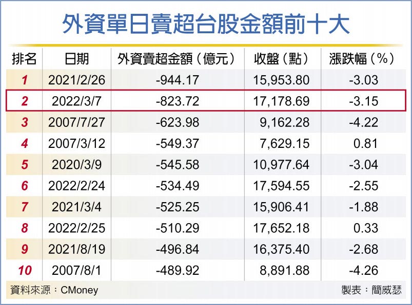 國際資金7日受油價單日大飆漲、通膨疑慮火速升溫影響,大賣台股823.7億元,超越2007年7月27日的623億元,改寫歷史單日第二大賣超,僅次於2021年2月26日的944億元,本次出脫金額極大,且集中狂砍晶圓代工雙雄與台灣50,確實令市場瀰漫不安情緒。