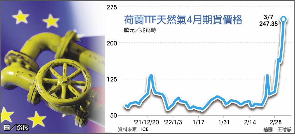 歐洲參考指標荷蘭天然氣交易中心(Dutch TTF)天然氣期貨價格周一曾遽升79%到每兆瓦時(MWH)345歐元,雖然之後漲勢收斂、回落到279歐元,但仍較上周五(4日)收盤勁漲近五成。在4日以前,天然氣價格從未漲破200歐元。
