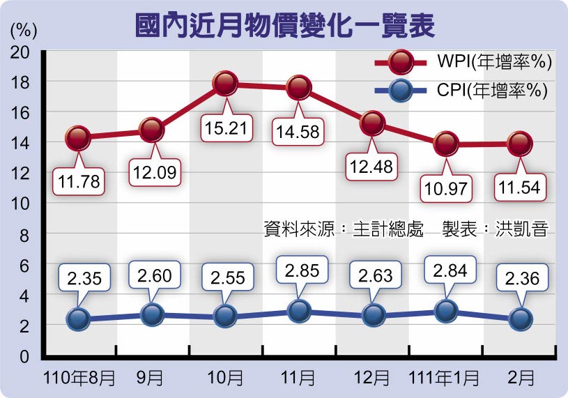 主計總處專門委員曹志弘表示,俄烏戰爭油料費上漲,小麥等大宗商品價格也持續上揚,2月躉售物價指數(WPI)年增11.54%的漲幅,預期3月將持續擴大,而去年3月CPI年增率為1.23%,在比較基期低的情況下,今年3月的CPI漲幅同樣會面臨擴大的壓力。