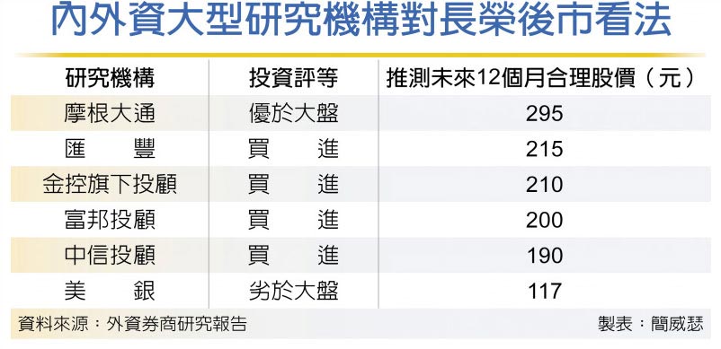 樂觀派的摩根大通證券看好,長榮不論是獲利或配發率都優於預期,在俄烏戰爭、油價高漲等外部驚濤駭浪中,是值得投資並可度過風浪的好標的,給予295元高檔股價預期,匯豐證券也把股價預期升至215元,多頭陣營看反攻「2」字頭具有一定共識。連給予「劣於大盤」投資評等的美銀證券都提出,將長榮的現金股利與減資返還的現金加總起來,股東總共可拿到每股純益50%以上回報,在股東回報環節算是優於預期。