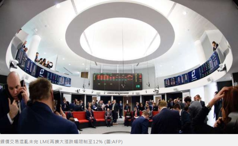 LME 周三恢復鎳期貨交易,並把買賣區間設在上周暫停交易前報價的上下 5%,是成立 145 年來創舉。但當天交易混亂未平息,LME 因此把鎳期貨的漲跌幅限制提高到 8%。