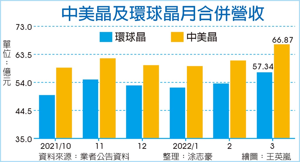 矽晶圓廠環球晶(6488)6日公告第一季合併營收163.07億元,母公司中美晶(5483)第一季合併營收衝上187.59億元,同步創歷史新高。由於矽晶圓供不應求,客戶與環球晶簽訂長約並預付貨款,漲價效益開始發酵,加上今年產能均已被客戶預訂一空,法人看好環球晶今年營收逐季改寫新高紀錄,中美晶營運亦將水漲船高。
