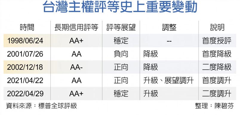 標普全球評級(S&P)29日宣布,考量經濟表現強勁及強健對外部位,調升台灣主權長期信用評等至「AA+」,評等展望「穩定」。距上一次調升台灣主權評等才剛滿一年,連續2年調升,創下主權評等史的新紀錄,而本次的「AA+」等級,也讓台灣重回2001年的水準。