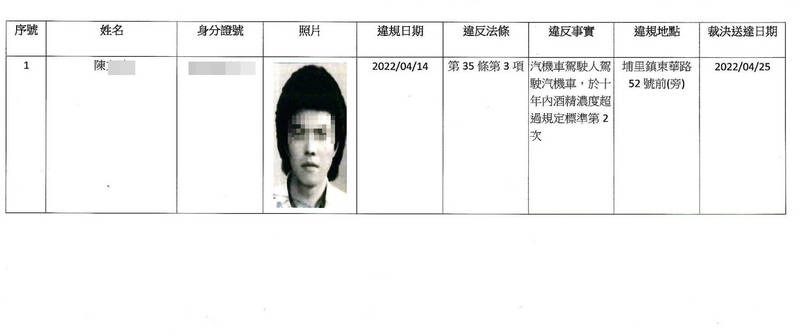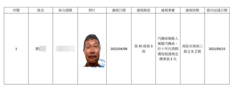 南投監理站公布的劉姓酒駕累犯,上月8日在南投南崗三路再度酒駕,而南投埔里分站分布的陳姓酒駕累犯,則是上月14日在埔里鎮東華路再度酒駕,2人的姓名和照片都清楚揭露,不再有遮掩或打馬賽克。