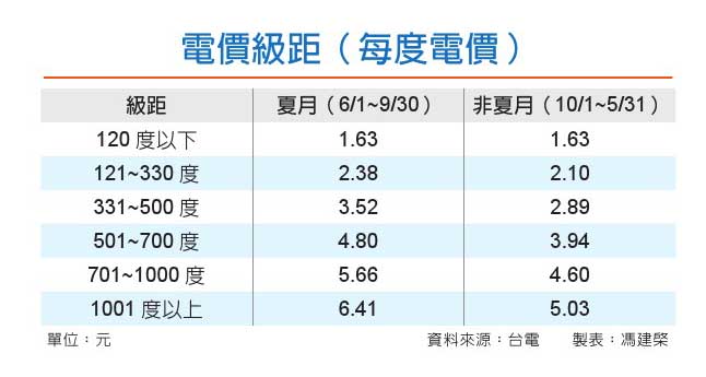 依照目前電價公式計算,夏月電價級距120度以下用戶不調漲(每度為1.63元),每月用電在121~330度調漲13%,331~500度調漲22%(每度3.52元),501~700度漲22%,701~1,000度調漲23%,1,001度以上調漲27%(每度6.41元),希望以價制量讓民眾節約用電。