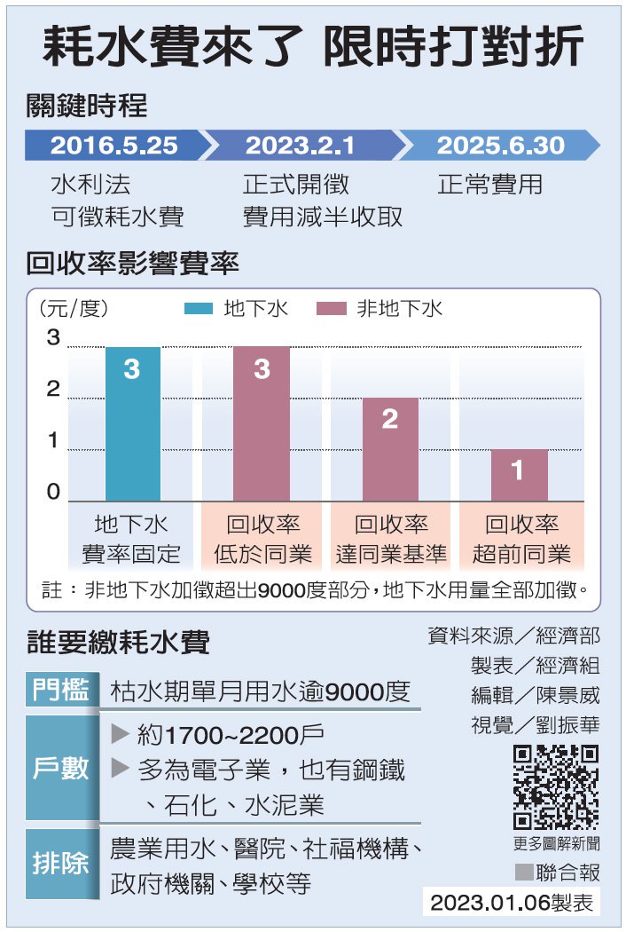為了使用水大戶有緩衝期進行節水設備投資,二○二五年六月卅日前用水大戶耗水費減半收取。