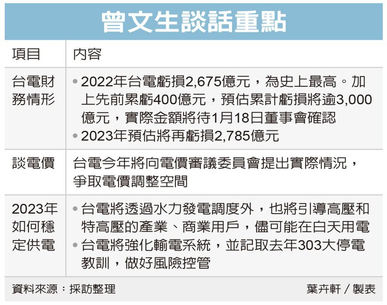 國際能源價格飆漲,導致台電先前不斷吸收發電成本漲幅,台電代理董事長、經濟部次長曾文生昨說,台電去年虧損兩千六百多億元,預估今年將再多虧兩千七百多億元,兩年虧損逾五千四百億元。他說,台電、中油除補貼、增資,也要將成本合理反映在電價。