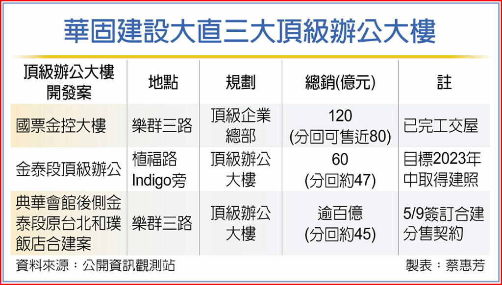 滿手現金的華固建設獵地再傳捷報!華固9日公告,取得北市大直商圈典華會館後側的台北和璞飯店合建案,土地面積達1,600多坪;華固表示,預計開發為頂級辦公大樓,以分回比率推算,可望分回可售金額約45億元,全棟總銷預估突破百億大關。