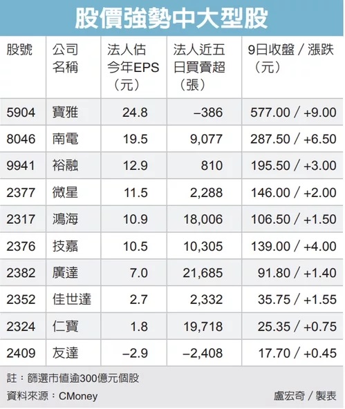 市場風險意識提高,漲多題材股昨(9)日賣壓湧現,所幸佳世達(2352)、仁寶、鴻海等中大型股表態穩盤,台股仍力守月線、季線,法人建議多元布局收成的電子大廠,具穩中帶攻特質,短多可優先關注。