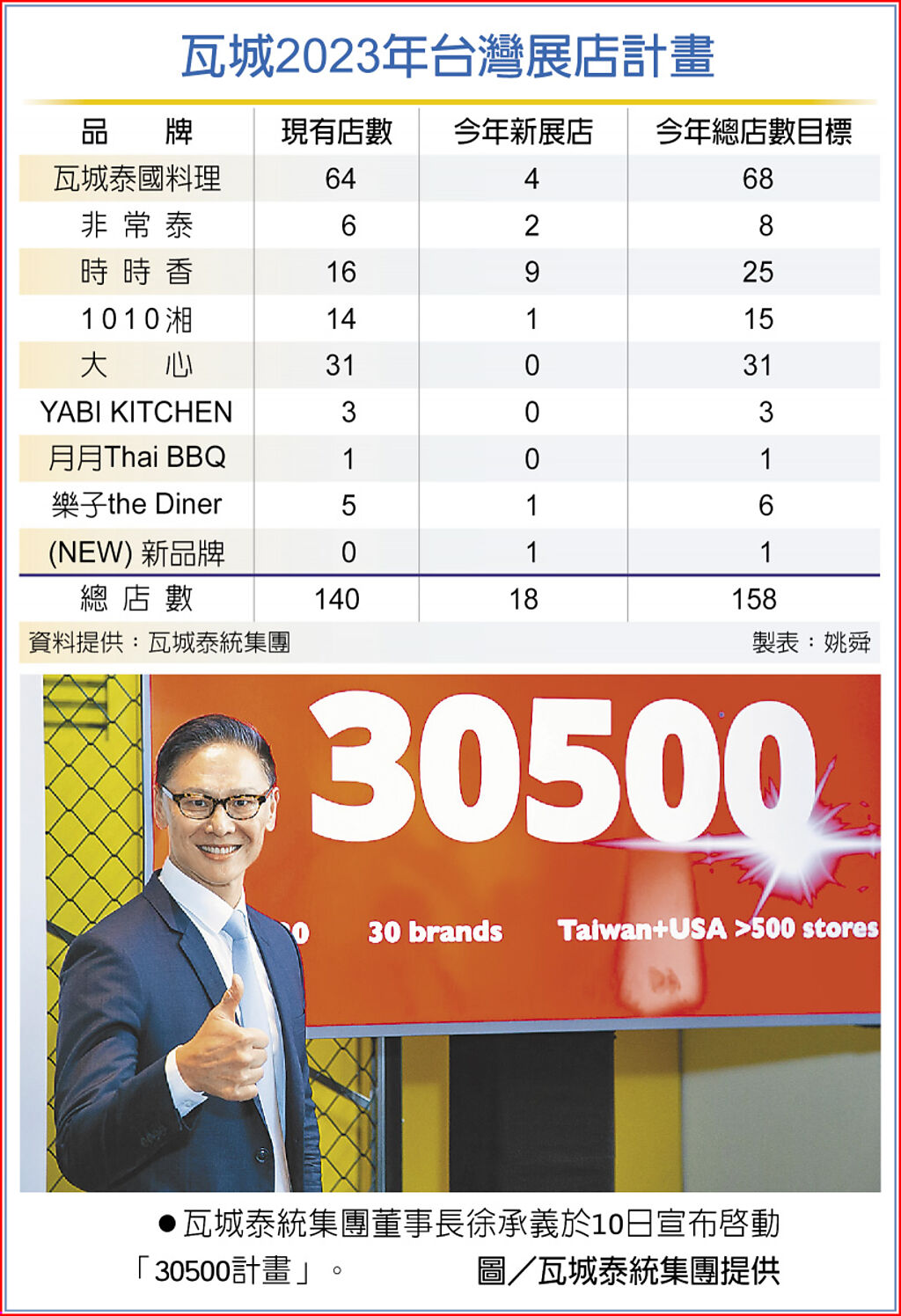 瓦城泰統集團今年首季展現亮眼成果,EPS達4.84元超越2022全年,4月營收年增超過63%。為加速拓展台灣市場版圖,徐承義表示,今年預計開出18家新店,包含9家時時香、4家瓦城、2家非常泰、1家1010湘,還有7月首次插旗台中的樂子the Diner,以及預計第四季亮相的全新泰式餐飲品牌,集團店數目標雙位數成長達158家。