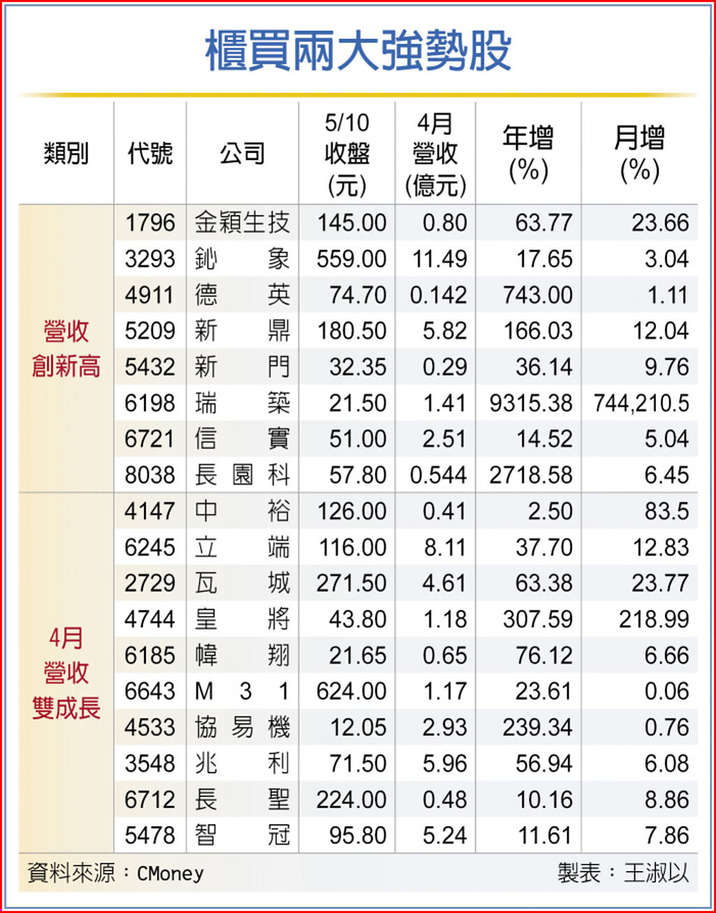 上櫃公司今年4月營收寫下新高的個股有金穎生技(1796)、鈊象(3293)、德英(4911)、新鼎(5209)、新門(5432)、瑞築(6198)、信實(6721)、長園科(8038)等八檔。