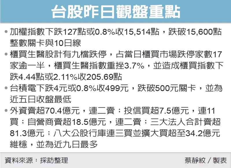 原本在盤面相對強勢的生技、重電儲電等政策受惠股通通拉回,尤其是生醫股成為昨日殺盤重心,在內外資連手下,櫃買生醫指數重挫3.7%為全市場最多、跌停家數達九檔、占櫃買市場跌停家數17檔逾一半。