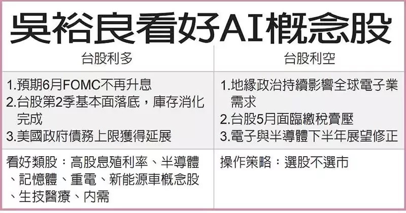台股第2季以來表現並不突出,主要是電子產業整體清庫存動作仍然持續,全球電子產品需求面並未明顯復甦。值得注意的是AI ChatGPT相關產業仍有明顯增加下單動能,加上美國強勁的就業市場,今年可能稍微慢到的需求反轉可能在第2季末或第3季產生。