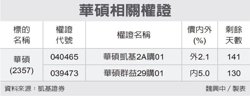華碩由於上周法說會釋出亮點,其中尤以積極擴展伺服器布局最受矚目,吸引買盤積極挺進,拉動股價。建議看好華碩後市的投資人,可挑選價內外5%以內、或距離到期天數超過四個月以上的相關權證進行布局。(凱基證券提供)