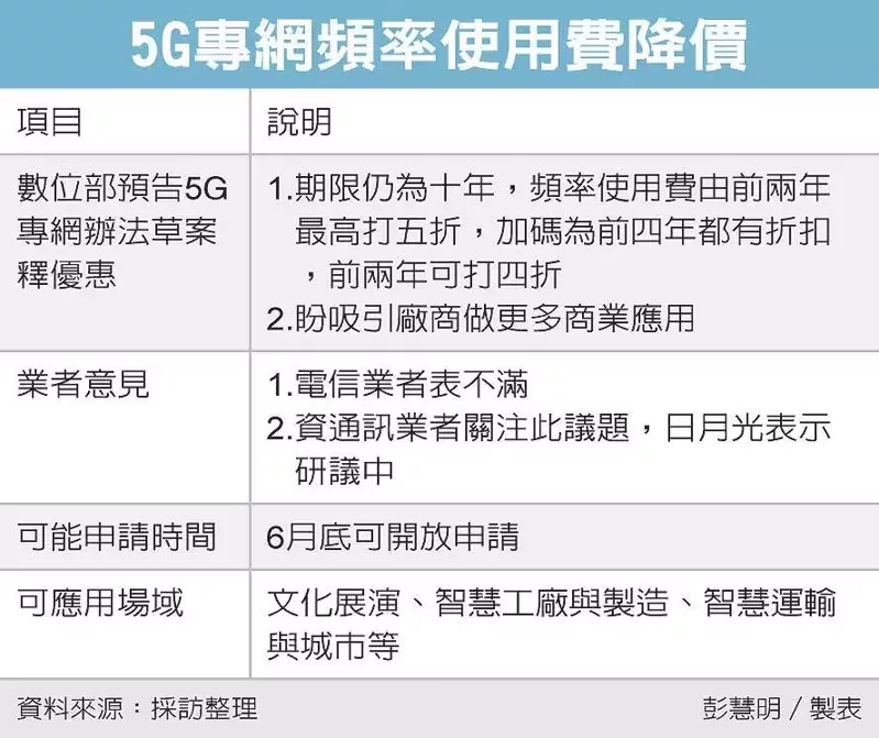 5G專網將從概念性驗證走向商用,數位部初期優惠再擴大。數位部預告相關辦法,最大亮點在於調降5G專網頻率使用費,執照期限十年,原版本是前二年使用費最高可打五折,新版本「加碼」前四年打折,其中前兩年可打四折,盼透過降低使用費率增加誘因,提升商用可能性,最快6月底前可開放申請。