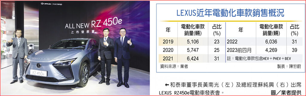 鞏固龍頭地位,和泰車續以多元電動化車款強化布局新能源車市,16日發表LEXUS全新電動車RZ450e,並宣布推出的「充電漫遊」服務,總經理蘇純興表示,今年配額200輛,若加計TOYOTA的bZ4X,雙品牌合計純電車款銷量將突破1,000輛,將創和泰車純電車銷量歷年新高。