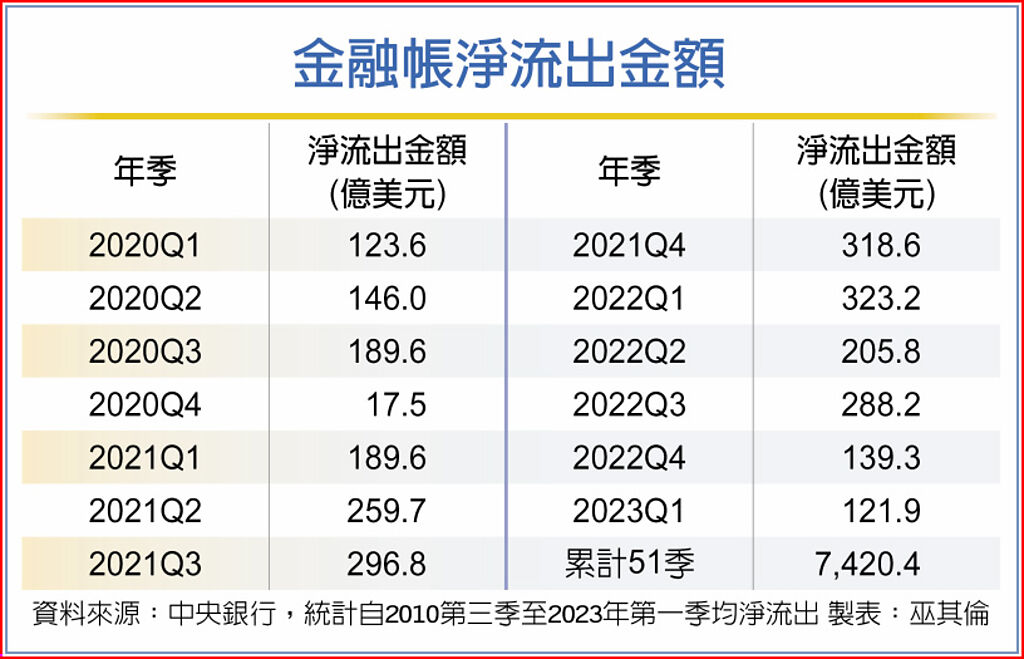 中央銀行19日公布今年第一季國際收支,經常帳順差190億美元,創2020年第二季以來新低;金融帳淨流出121.9億美元,則是前年第一季以來新低,且已連51季淨流出、續創史上最長紀錄,累計淨流出已約7,420億美元;央行準備資產則增加47.2億美元。