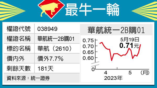 看好華航後市表現的投資人,可以留意連結的權證為華航統一2B購01(038949),目前處於價外7.7%,剩餘天數181天。