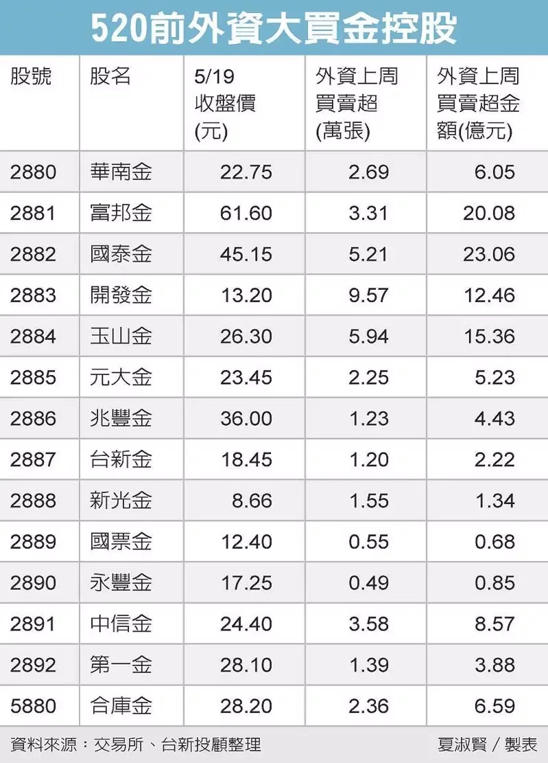 台新投顧副總經理黃文清指出,外資在520前一周全面性買超金控股,今年來累計買最多是國泰金,回補60幾億元,台新金買了38億元,買超兆豐金近20億元。