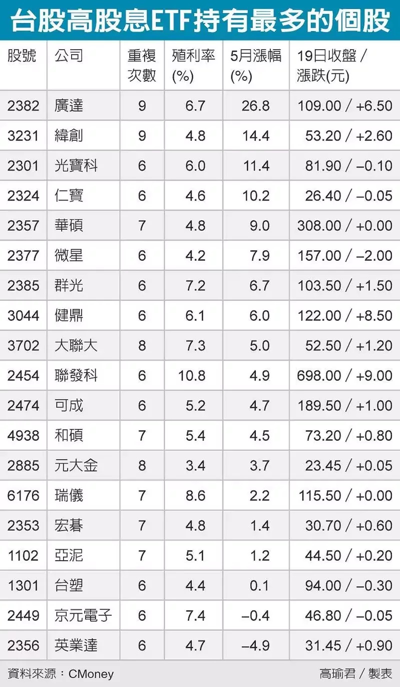 高股息ETF吸金能力一流,儼然成為台股熱門投資標的,盤面上訴求高股息、存股主題的台股ETF有11檔,合計規模高達4,848億元,入列ETF成分的個股身價也水漲船高,尤其光寶科、仁寶、微星等19檔被高度重複持有,更是立於「下檔有撐、上檔看俏」的不敗之地。