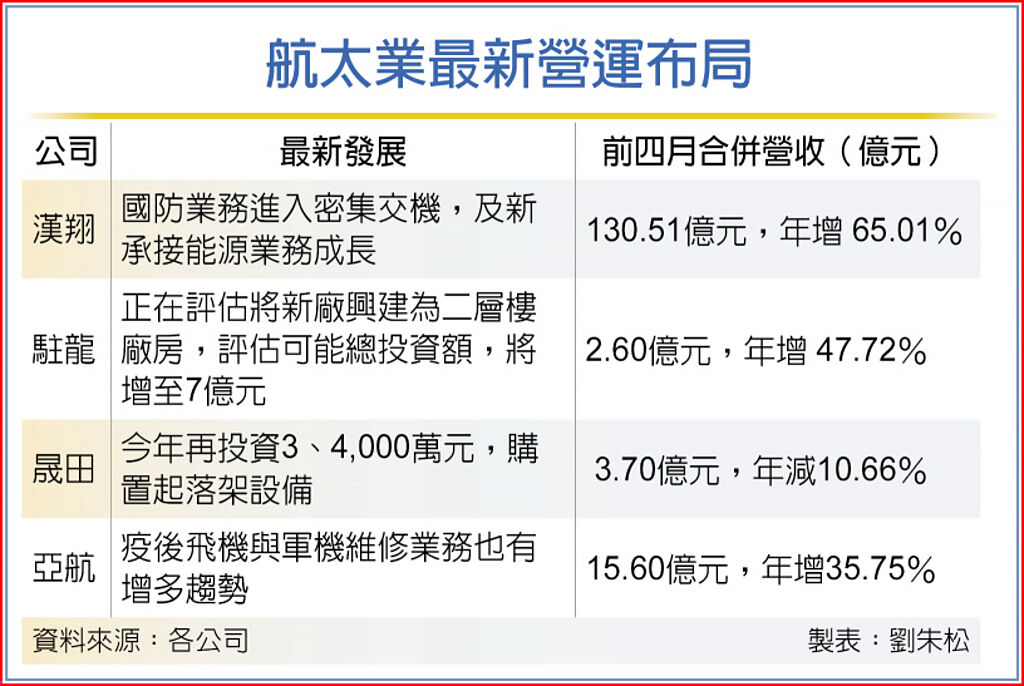 疫後飛機引擎零組件、結構件及起落架零組件需求持續提升,飛機製造商客戶訂單確認度高,帶動包括漢翔、駐龍及晟田等國內航太業者今年營運轉強,飛機維修廠亞航在疫後的民航機、軍機維修業務也有增多趨勢,且行業去年營運基期偏低下,讓今年航太業者營運有「倒吃甘蔗」的表現。